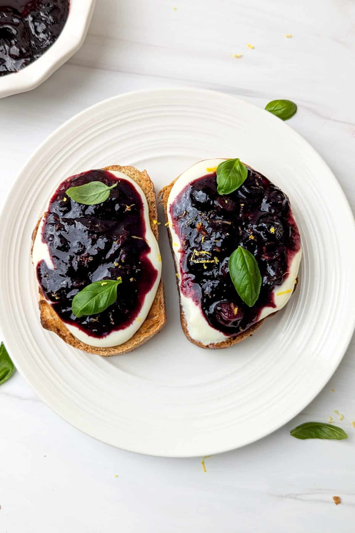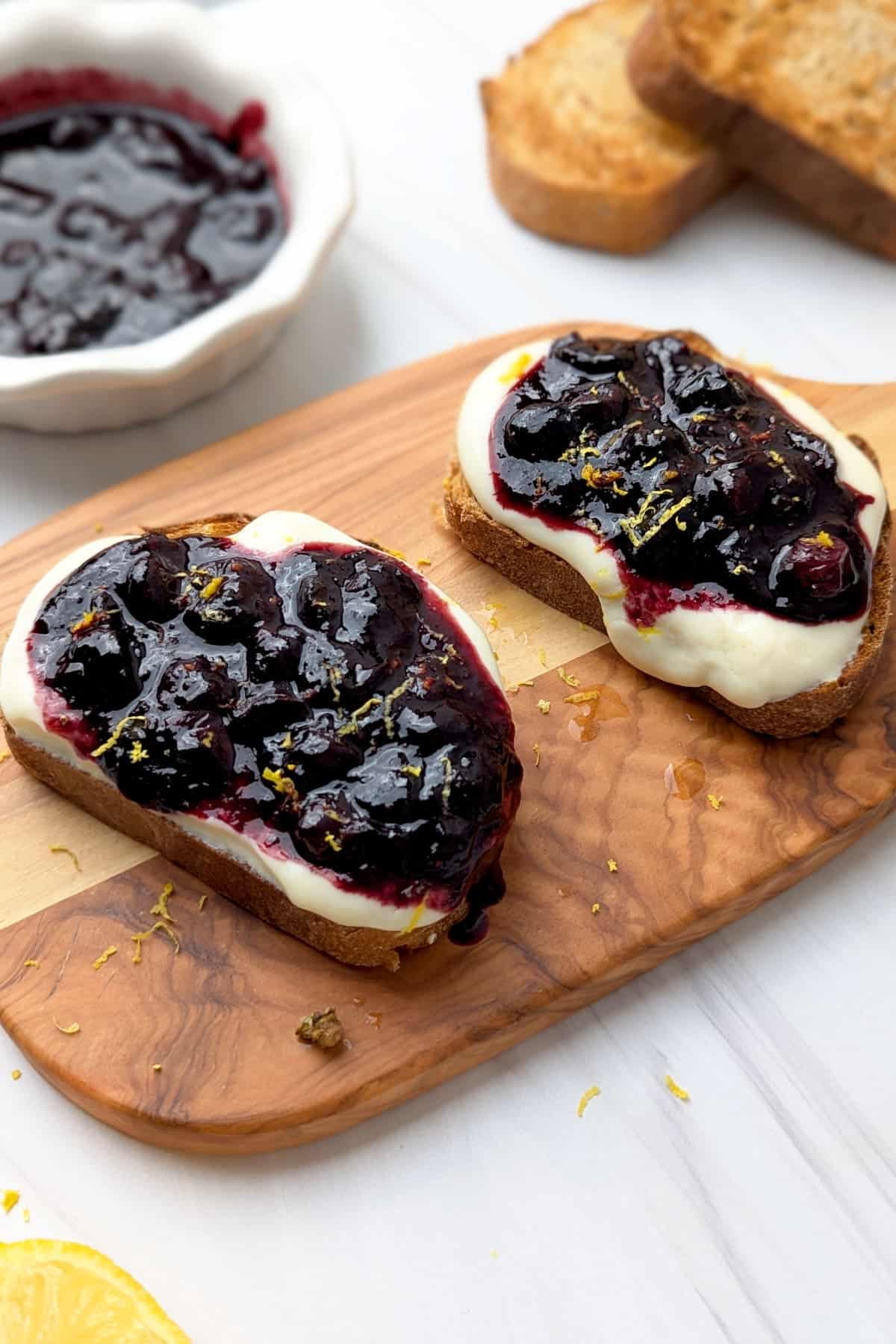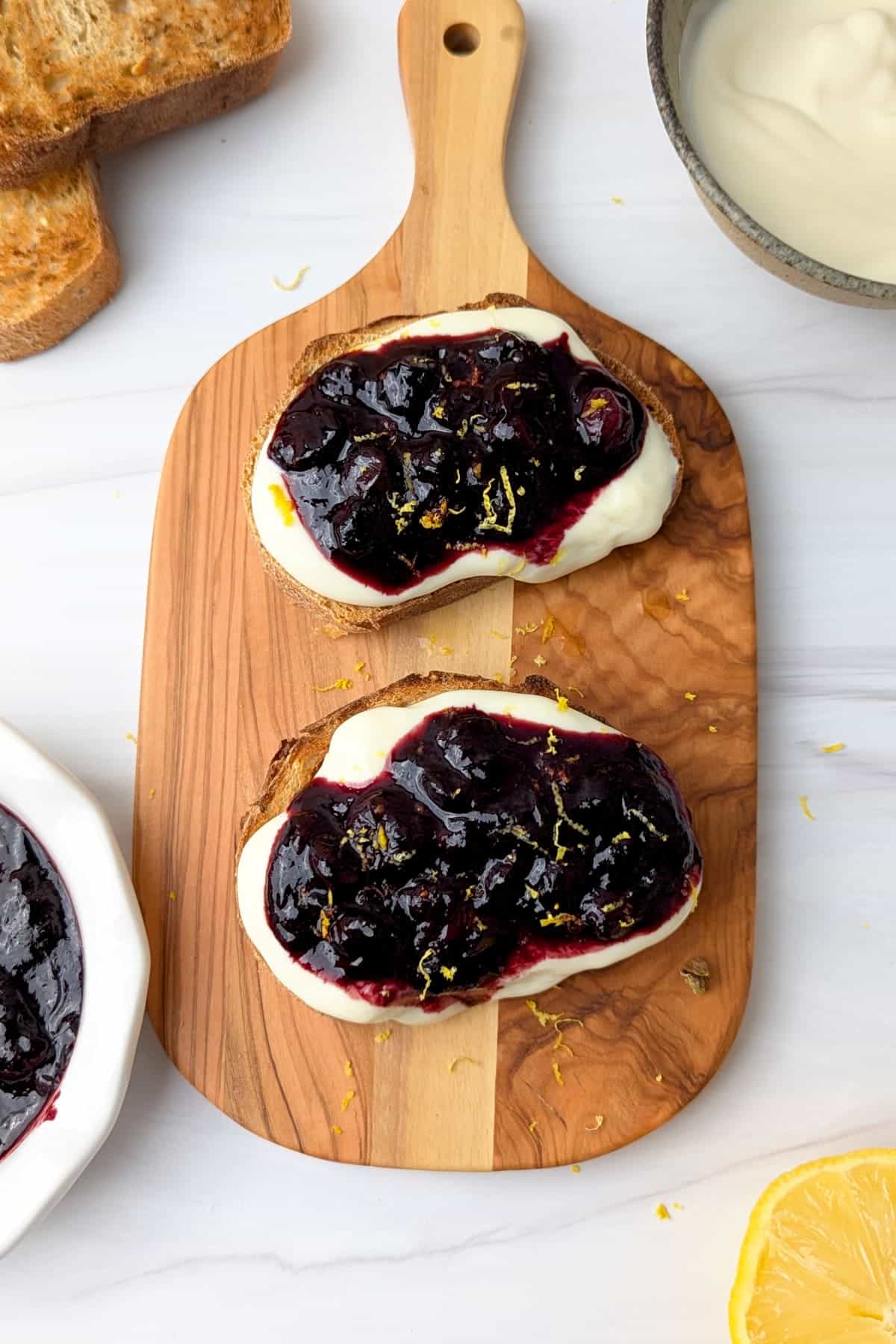 - Assemble the toast: Spread a generous layer of soy yogurt on each slice of toast. Top with the warm blueberry topping.1/2 cup plain unsweetened yogurt