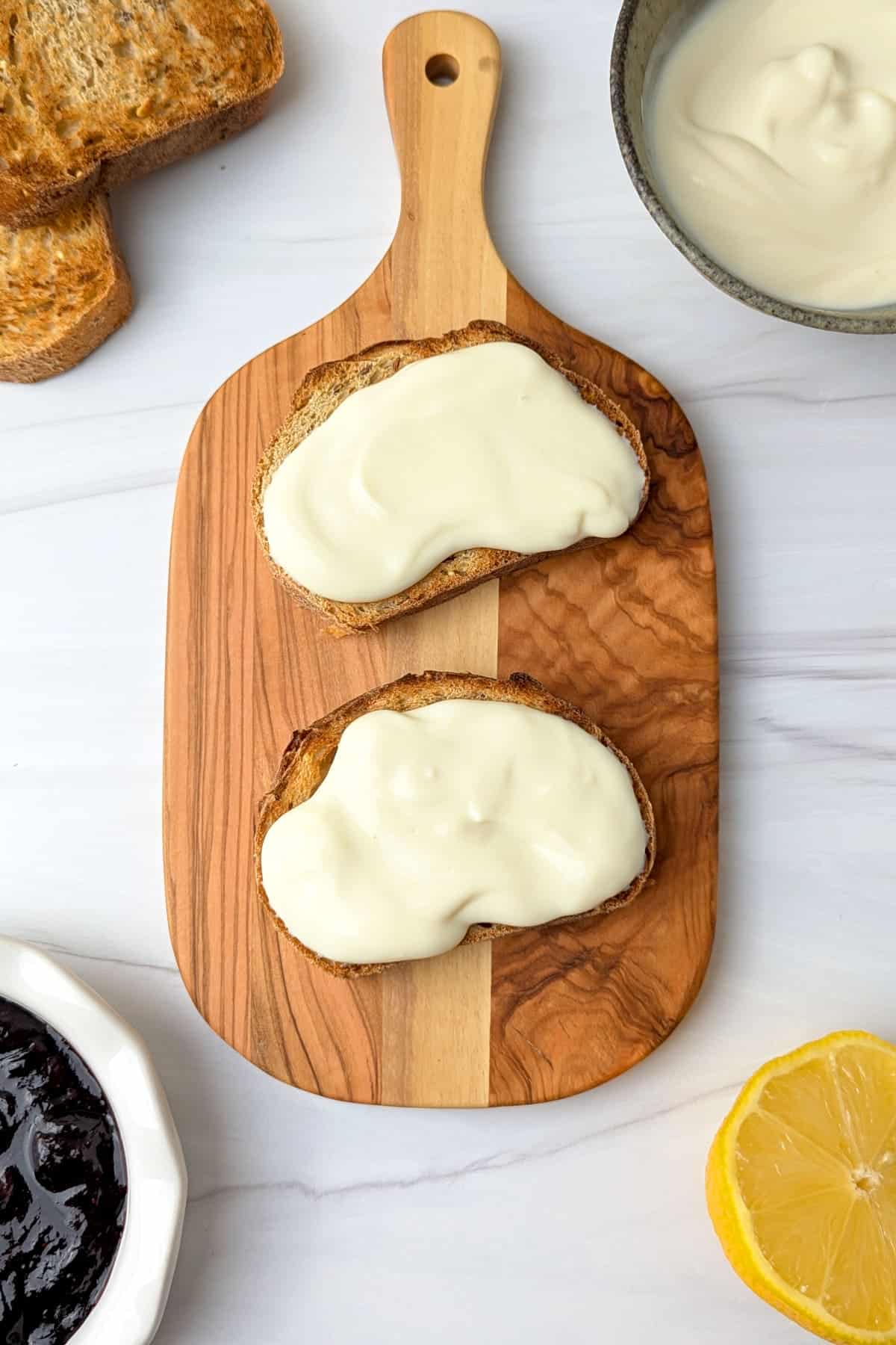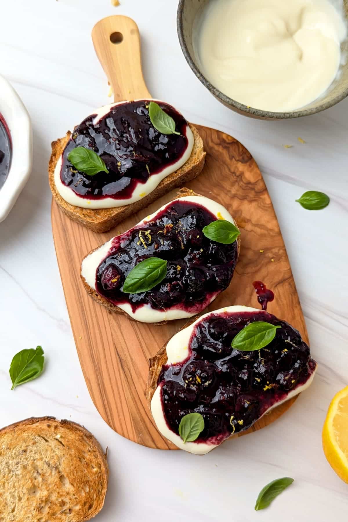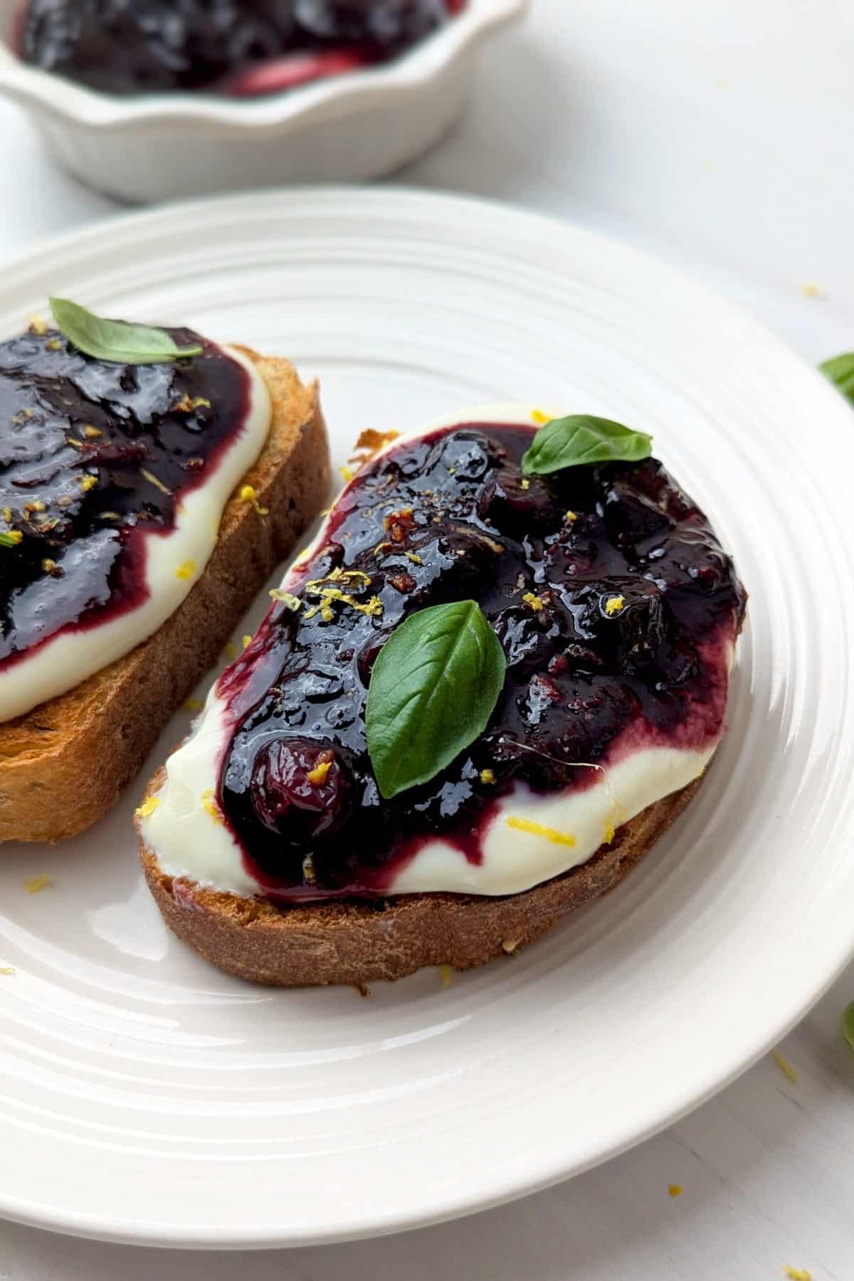 - Assemble the toast: Spread a generous layer of soy yogurt on each slice of toast. Top with the warm blueberry topping.1/2 cup plain unsweetened yogurt