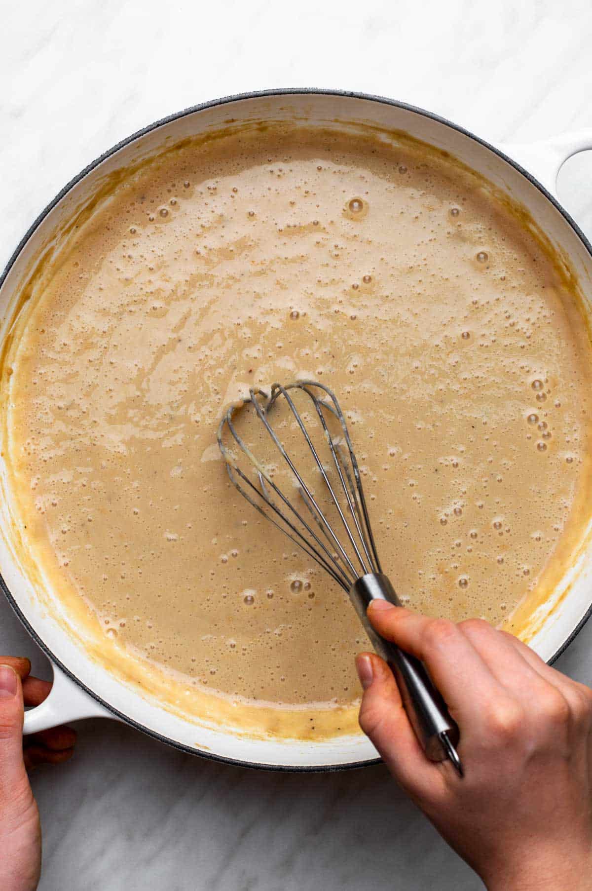 Step 1: Make the creamy sauce – In a large skillet, combine non-dairy milk, onion powder, garlic powder, cornstarch, salt, and pepper. Bring to a gentle boil while whisking until it starts to thicken.