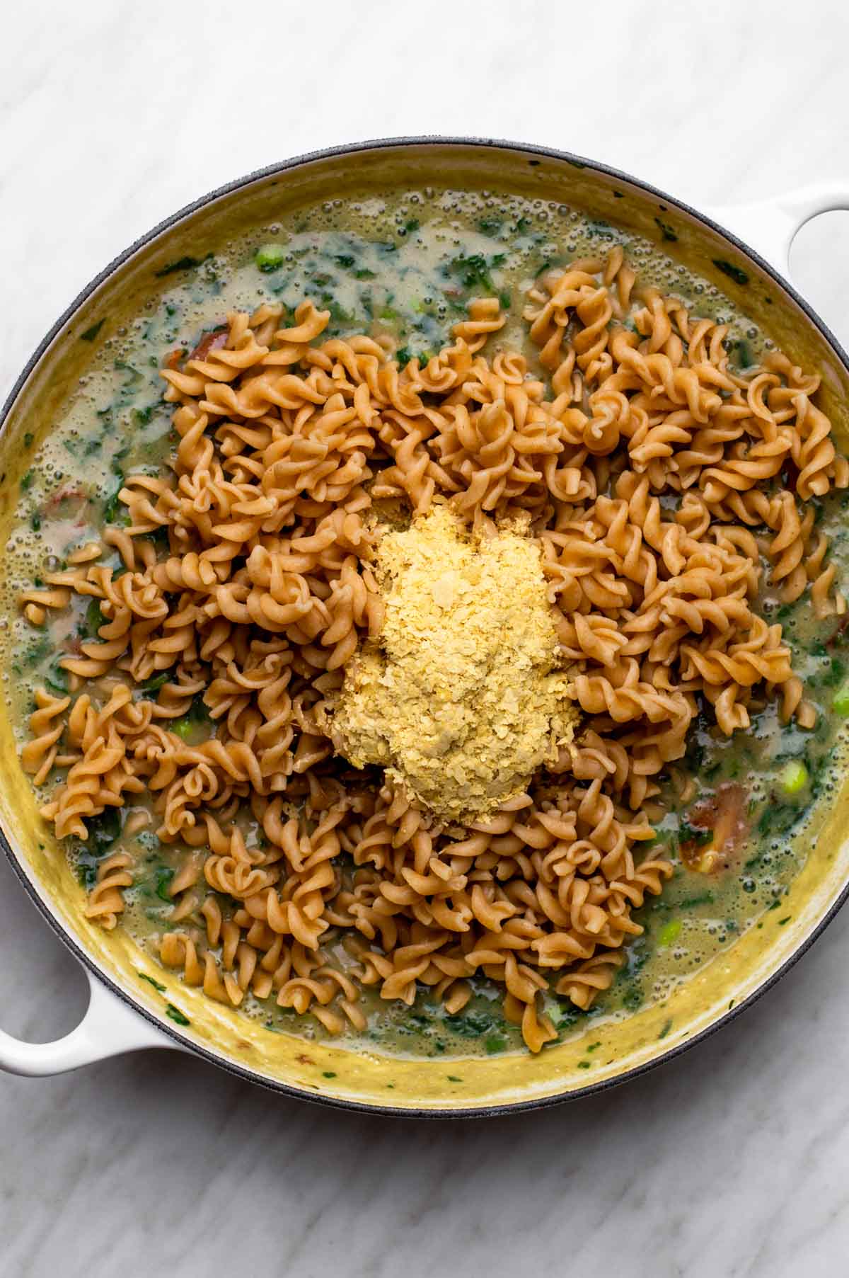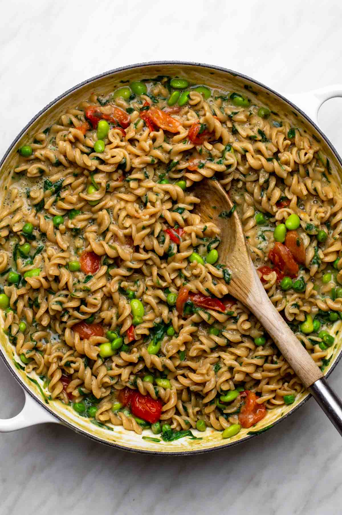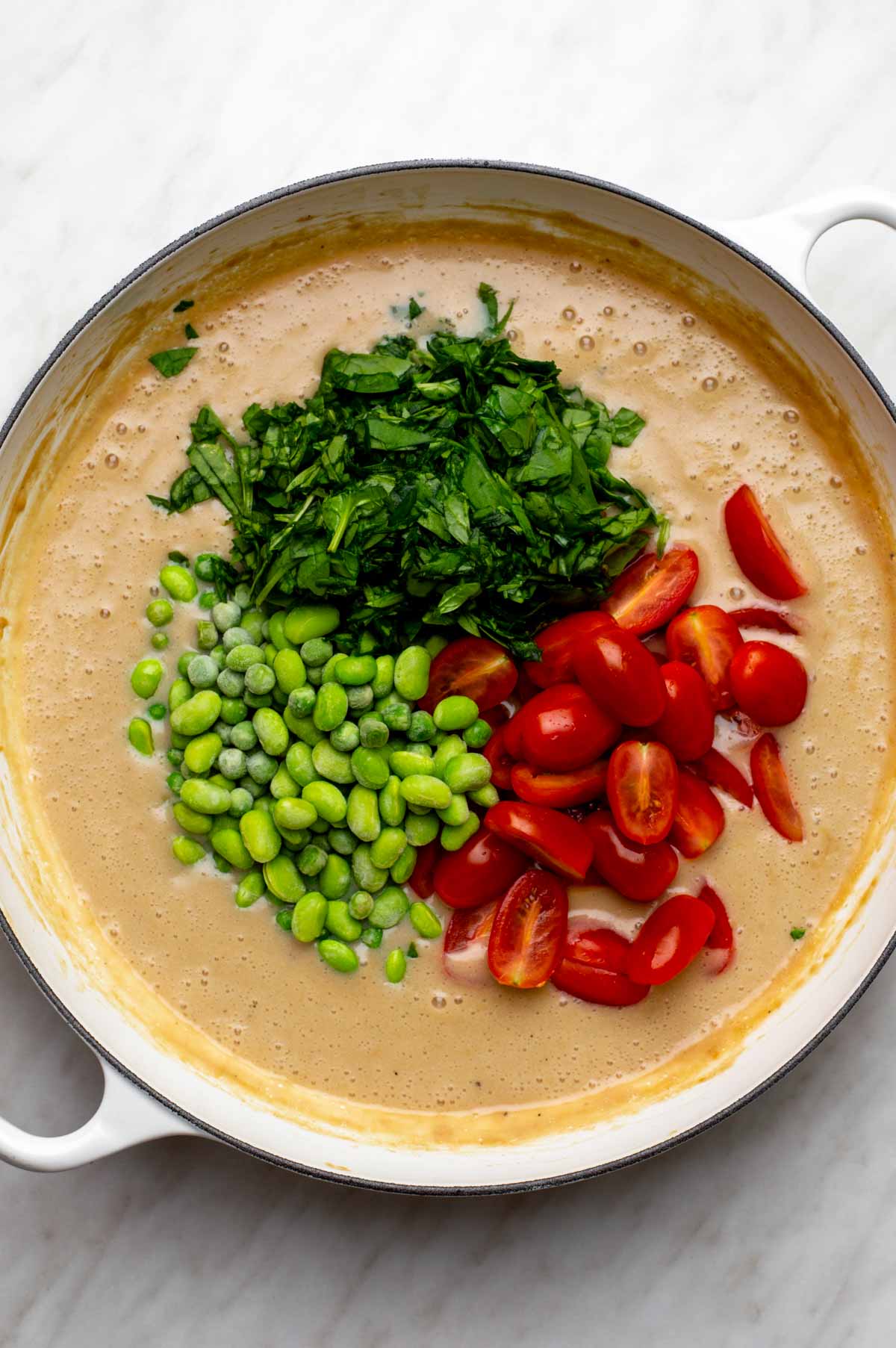 - Add peas, edamame, cherry tomatoes, and spinach. When the sauce is simmering again and the spinach has wilted, add the cooked pasta, nutritional yeast if using, and lemon juice. Stir until everything well-coated. Divide into bowls and enjoy!